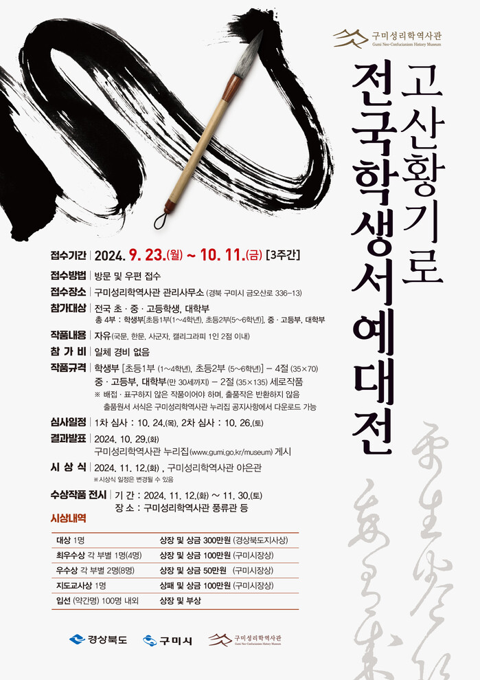 이번 서예 공모전은 전국의 초ㆍ중ㆍ고등학생 및 대학생을 대상으로 하며, 오는 9월23일부터 10월11일까지 3주간 구미성리학역사관 관리사무소에서 접수를 진행한다.