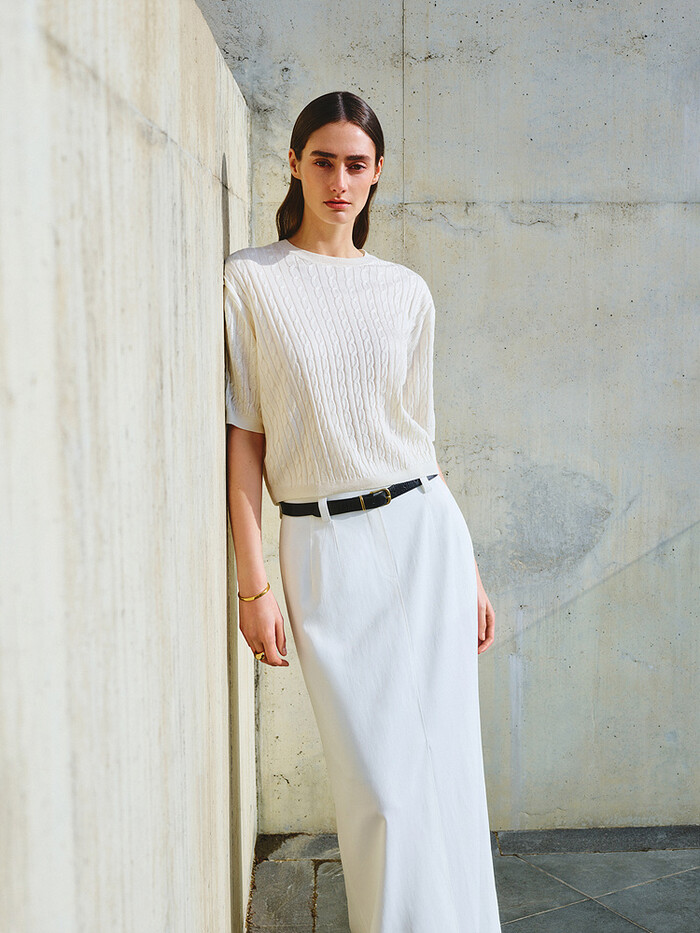 ‘여유로운 일상 속 클래식함’을 콘셉트로 한 이번 룩들은 간절기에도 부담스럽지 않게 착용 가능한 반팔 니트부터 스트라이프 가디건, 플리츠 소재의 셋업 등으로 구성되어 있다. 브라운, 네이비, 아이보리 등 클래식한 컬러로 선보여 부드럽고 우아한 무드를 자아낸다. 특히 소매와 카라의 화이트 배색이 돋보이는 가디건과 감각적인 트임의 롱스커트는 여성스럽지만 클래식함을 잃지 않는 더캐시미어의 철학이 그대로 담겨 있다는 것이 특징이다.