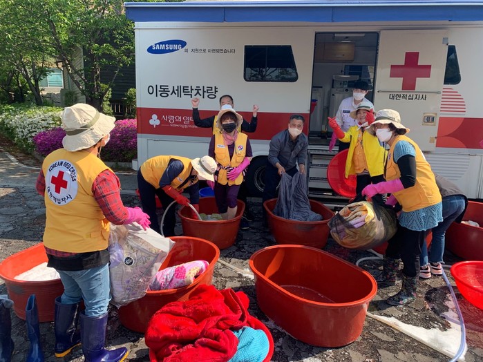 대한적십자사 포천지구 가산봉사회는 최근 경기 가산면행정복지센터에서 지역내 취약계층 30가구를 대상으로 이불 세탁 및 사랑의 열무김치 나눔 봉사활동을 펼쳐 이불과 의류 등을 세탁 후 직접 담근 열무김치와 함께 각 가정으로 전했다. 사진은 이날 회원들이 이불 세탁을 하고 있는 모습.(사진제공=포천시청)