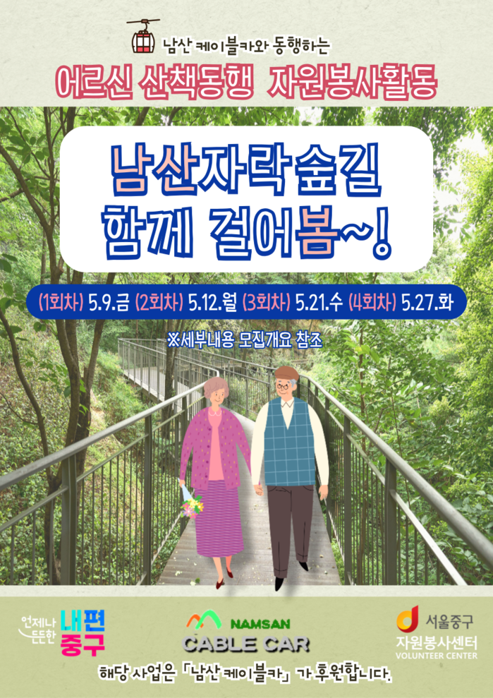 [시민일보 = 여영준 기자] 중구가 5월 한 달 간 관내 각 권역별로 매주 1회씩 관내 어르신과 자원봉사자가 함께 걷는 '남산자락숲길 함께 걸어봄~!' 산책 프로그램을 운영한다.