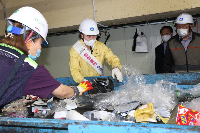 | ▲ 대형폐기물 중간처리장, 자원순환센터 등을 방문한 오언석 구청장(가운데)이 관계자들과 함께 작업을 하고 있는 모습. (사진제공=도봉구청) |