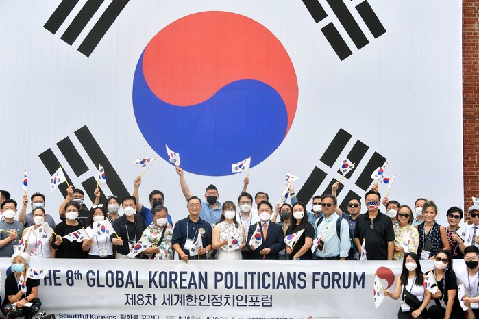 제8회 세계한인정치인 포럼 참가자들이 지난 18일 서울 서대문형무소역사관을 방문했다. 이 포럼은 16~19일 서울에서 미국, 영국 등 11개국 53명의 한인 정치인들이 참여해 ‘뷰티풀 코리안스, 평화를 꿈꾸다’란 주제로 진행됐다. 사진은 이날 이성헌 구청장(앞줄 가운데)이 포럼 참가자들과 옥사 벽면 대형 태극기 앞에서 기념촬영을 하고 있는 모습.(사진제공=서대문구청)