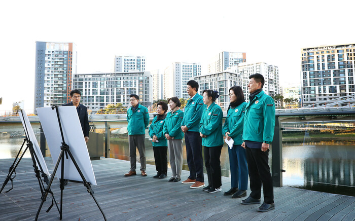 이어서 위례호수공원을 방문하여 현안사항에 관해 브리핑을 받은 후, 위례호수의 담수계획용량 및 계획하폭과 관련해서 SH(서울주택도시공사)와의 긴밀한 협조를 강조했다.