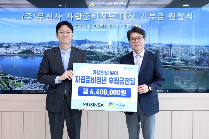 [시민일보 = 변은선 기자] 서울 성동구(구청장 정원오)는 5월 '가정의 달'을 맞아 무신사와 함께 성동구 거주 자립준비청년에게 기부금을 후원한다고 밝혔다.