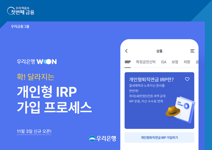 [시민일보 = 홍덕표 기자] 우리은행은 개인형 퇴직연금(IRP) 이용 고객들의 편의성 제고를 위해 신규 가입 및 자산관리 프로세스를 개선한다고 3일 밝혔다.