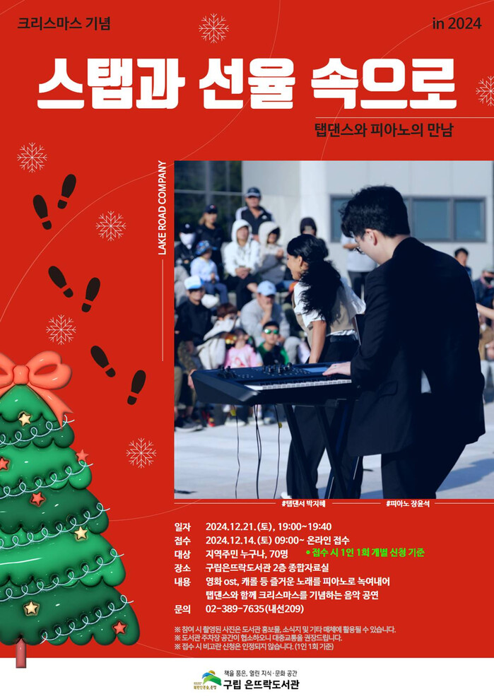은뜨락도서관은 이번 행사를 통해 주민들에게 경쾌한 탭댄스 박자와 피아노 선율로 캐럴과 영화 배경음악(OST) 등을 연주해 선보인다. 크리스마스 분위기를 형성해 도서관에서의 특별한 추억을 선사하고자 한다.