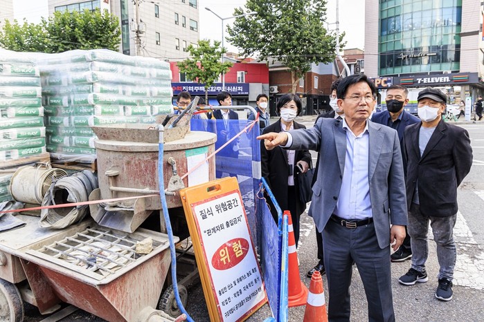 박강수 서울 마포구청장은 5일 ‘제5차 현장구청장실’을 운영했다. 이날 박 구청장은 홍대 걷고싶은거리, 홍익문화공원 등을 현장 점검했다. 사진은 박 구청장(앞쪽)이 현장 점검을 하고 있는 모습. (사진제공=마포구청)
