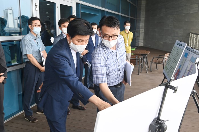 조용익 경기 부천시장은 지난 18일부터 5일간 시의 주요사업 현장 11곳을 찾아 사업추진 경과를 보고받고 직접 현장을 둘러볼 계획으로, 첫 날 웹툰융합센터 및 예술인주택 건립 현장을 찾았다. 사진은 지난 18일 조 시장(앞쪽 왼쪽)이 부천영상문화산업단지에서 복합개발사업 전반에 대한 브리핑을 받고 있는 모습. (사진제공=부천시청)