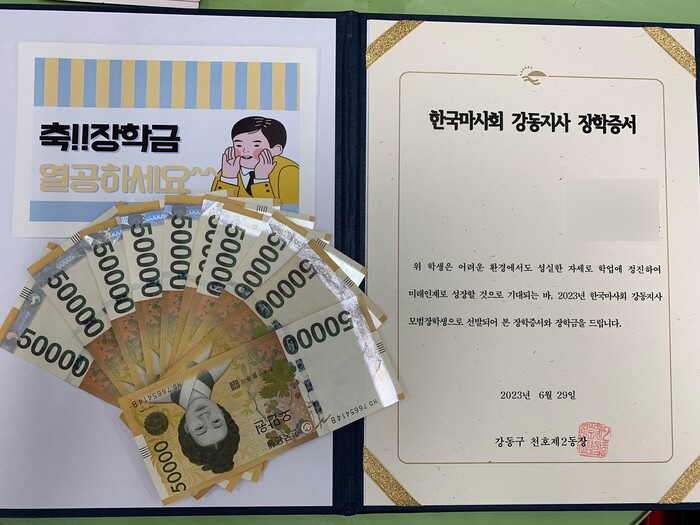 지난달 29일 개최된 청소년 장학금 지원사업에서는 경제적 어려움을 겪고 있는 저소득 청소년들의 꿈을 응원하기 위해 천호2동 관내 한부모가정 중·고등학생 10명을 선발하여 각각 50만원의 장학금을 지원하였다.