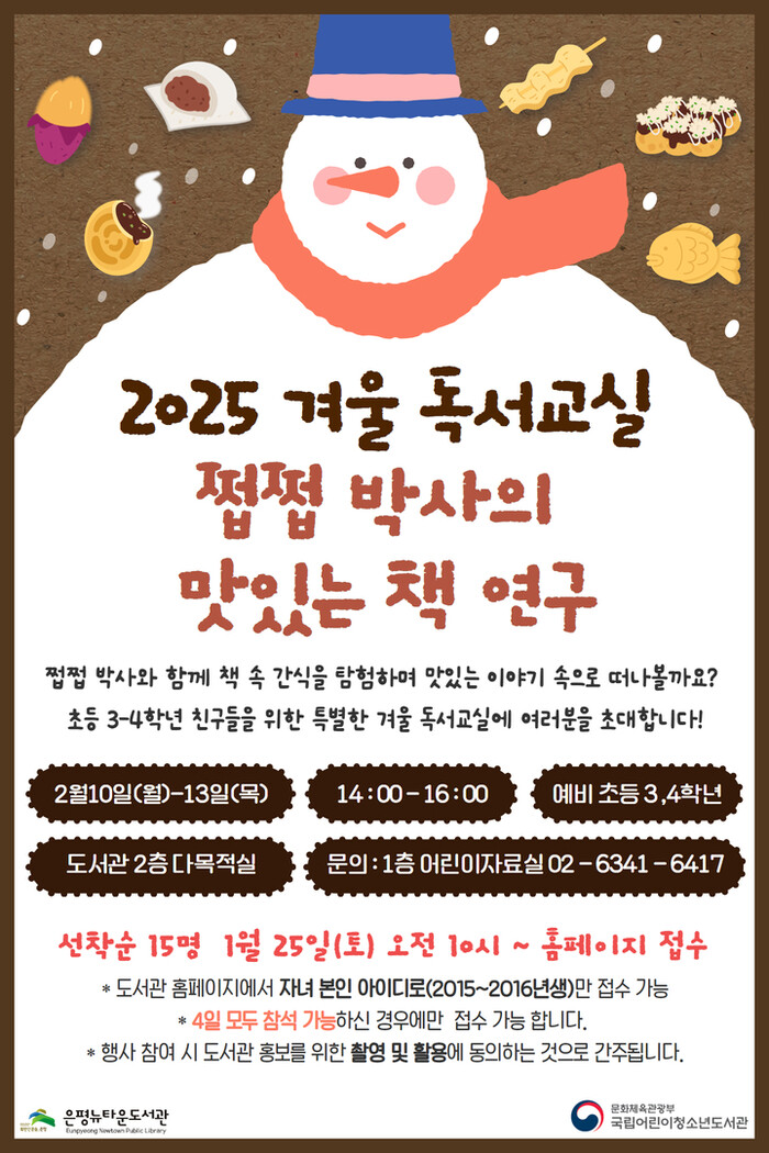 [시민일보 = 이대우 기자] 구립은평뉴타운도서관(관장 박종범)에서는 겨울방학을 맞아 초등학생을 대상으로 하는 독서교실 프로그램, <2025 겨울 독서교실 ‘쩝쩝 박사의 맛있는 책 연구’>를 운영한다.
