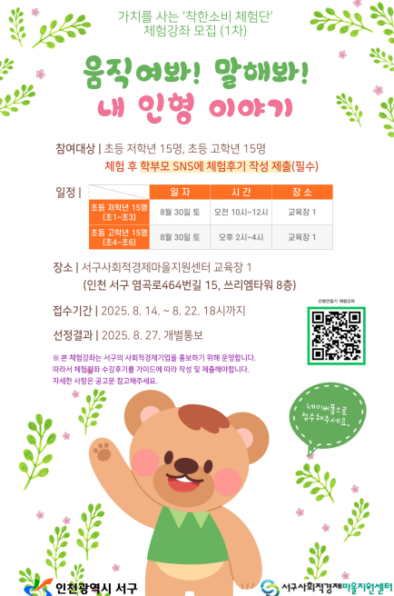 [인천=문찬식 기자] 인천 서구(구청장 강범석)는 사회적경제기업 제품의 판로 개척과 가치소비 문화 확산을 위해 ‘가치를 사는 착한소비 체험단’ 체험강좌 참여자를 모집한다고 밝혔다.