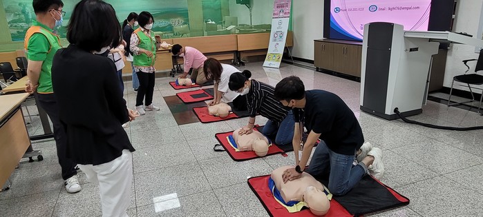 경기 김포시는 지난 11~12일 양일간 민원실 근무 직원 40여명을 대상으로 심폐소생술 및 AED(자동제세동기) 사용법 등 응급처치 교육을 실시했다. 교육내용은 심폐소생술, AED(자동제세동기) 사용법, 하임리히법 등으로 이론교육과 함께 교육용 마네킹을 활용한 실습 교육으로 진행됐다. 사진은 교육 참여자들이 심폐소생술 실습을 하고 있는 모습.(사진제공=김포시청)