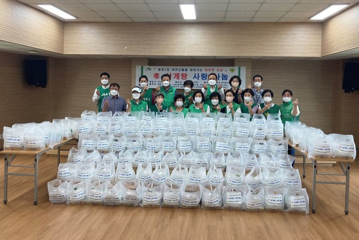 서울 은평구 불광1동이 최근 새마을부녀회 주관 ‘孝 삼계탕 사랑나눔’ 행사를 개최해 새마을부녀회원들이 직접 조리한 삼계탕을 포함해 김치, 양파초절임, 수건, 부채 등 보양식 선물세트 120개를 제작해 지역내 저소득 노인에게 개별 전달했다. 사진은 전달식에서 관계자들이 기념촬영을 하는 모습. (사진제공=은평구청)