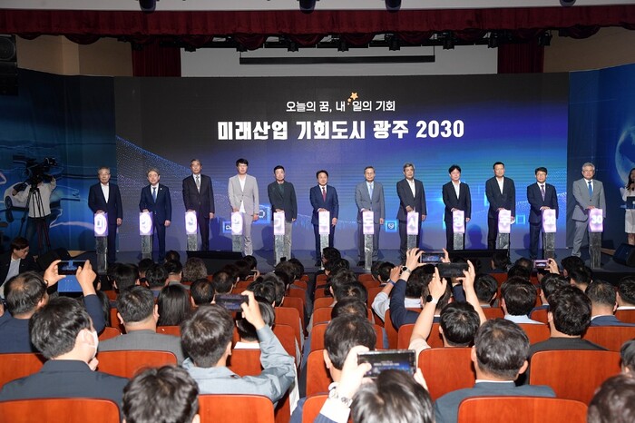강기정 광주광역시장은 24일 북구 첨단산단 이노비즈센터에서 열린 ‘광주 대표산업 2030 비전 보고회’에서 “미래산업도시 광주는 ‘기술, 실증, 인재’로 완성된다”며 “첨단기술을 선도하는 도시, 혁신기업이 태어나고 성장하는 도시, 창의인재가 모이는 도시를 만들겠다.”고 선언했다.