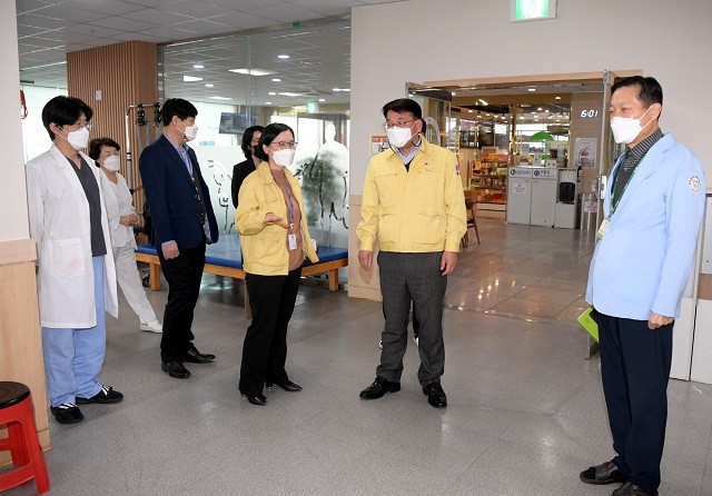 [광주=정찬남 기자] 김종효 광주광역시 행정부시장이 14일 서광주청연요양병원을 방문해 방역수칙 준수 여부를 확인하고 관계자의 애로사항을 청취하고 있다.