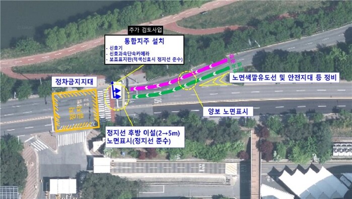 주요 공사 내용은 황색 정차금지대(옐로우존) 노면표시, 횡단보도 정지선(2→5m) 연장이다.