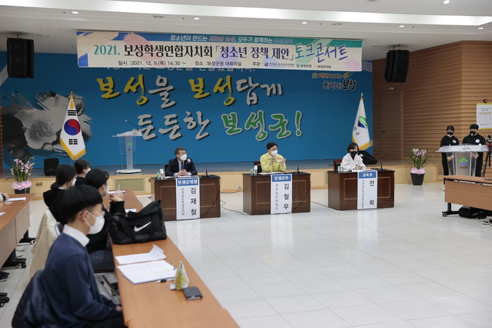 전남 보성군은 9일 군청 대회의실에서 '2021년 청소년 정책 토크 콘서트'를 열고 청소년들과 군정운영과 발전에 대해 논의했다. 이날 토크 콘서트에는 김철우 군수, 김재철 보성군의회 의장, 보성교육지원청 전희 교육장, 보성학생연합자치회 학생 등 50여명이 참석했다. 사진은 김 군수 및 관계자들이 청소년들과 이야기를 하고 있는 모습. (사진제공=보성군청)