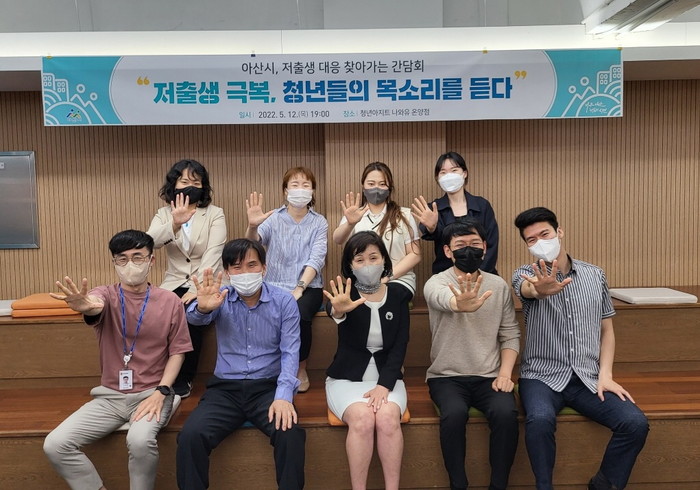 충남 아산시가 지난 12일 아이를 낳을 당사자인 청년들로부터 심각한 저출산 사회를 극복하기 위한 의견을 듣고자 ‘찾아가는 저출생 극복 간담회’를 진행했다. 이날 간담회에는 아산시 청년위원회 소속 위원 6명이 참석해 저출산에 대한 현실적인 의견을 제시했다. 사진은 참여자들이 기념촬영을 하는 모습.(사진제공=아산시청)