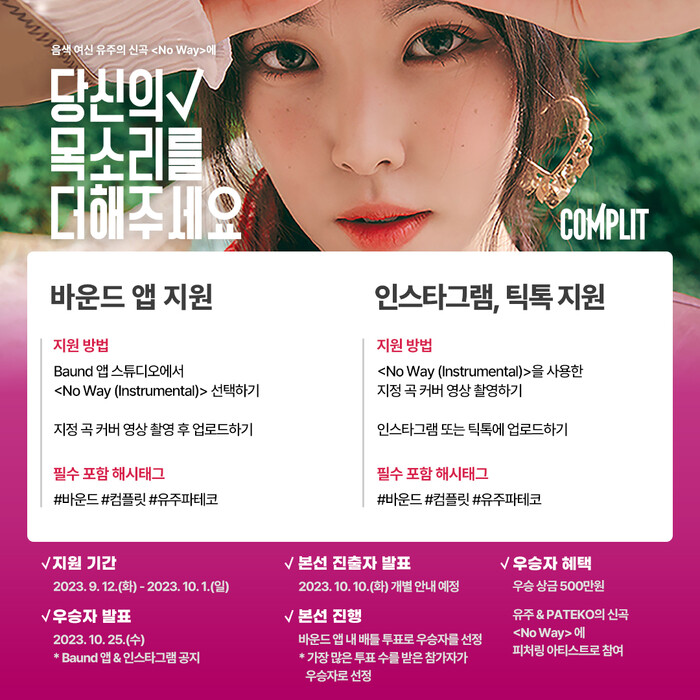 최종 우승자에게는 500만 원의 상금이 수여되며, 유주 & PATEKO의 신곡 ‘No Way’에 피처링 아티스트로 함께 할 기회가 주어진다. COMPLIT에 대한 자세한 사항은 바운드의 공식 SNS와 바운드 앱을 통해 확인할 수 있다.