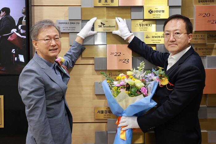 서울 구로구가 15일 ‘제78호 구로히어로즈 명예의 전당 헌액식’을 개최했다. 사진은 헌액식에서 명패를 등재하고 장 구청장(왼쪽)이 기념 촬영을 하는 모습. (사진=구로구청 제공)