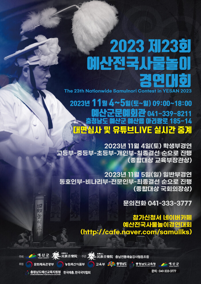 (사)민족음악원과 예산군 주최로 열리는 이번 대회는 코로나19 이후 첫 대면 경연대회로 진행되며, 사물놀이에 관심 있는 국민들의 큰 관심을 얻을 전망이다.