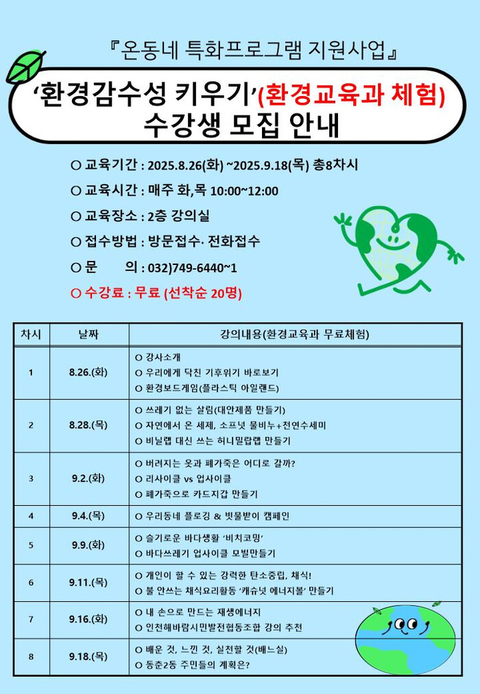 [인천=문찬식 기자] 인천 연수구 동춘2동 주민자치센터(주민자치회장 박세환)는 주민들의 환경 감수성과 실천력을 높이기 위한 ‘환경 감수성 키우기’ 프로그램 수강생을 모집한다.