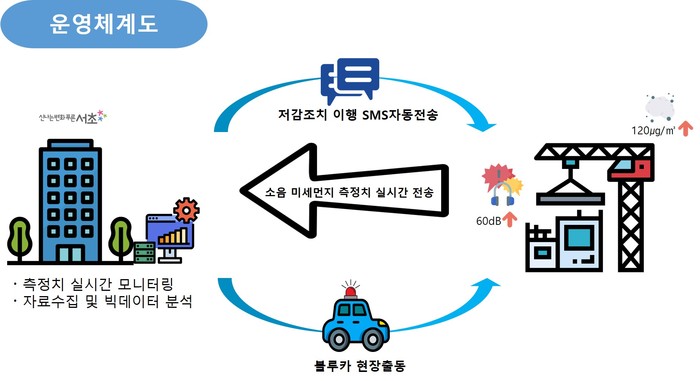 관제시스템은 2018년 전국 최초로 구가 구축한 것으로, 현재 서초동 5곳, 잠원동 4곳, 방배동 3곳, 반포동 3곳의 공사장 등 총 15곳에 측정기를 설치해 운영하고 있다.
