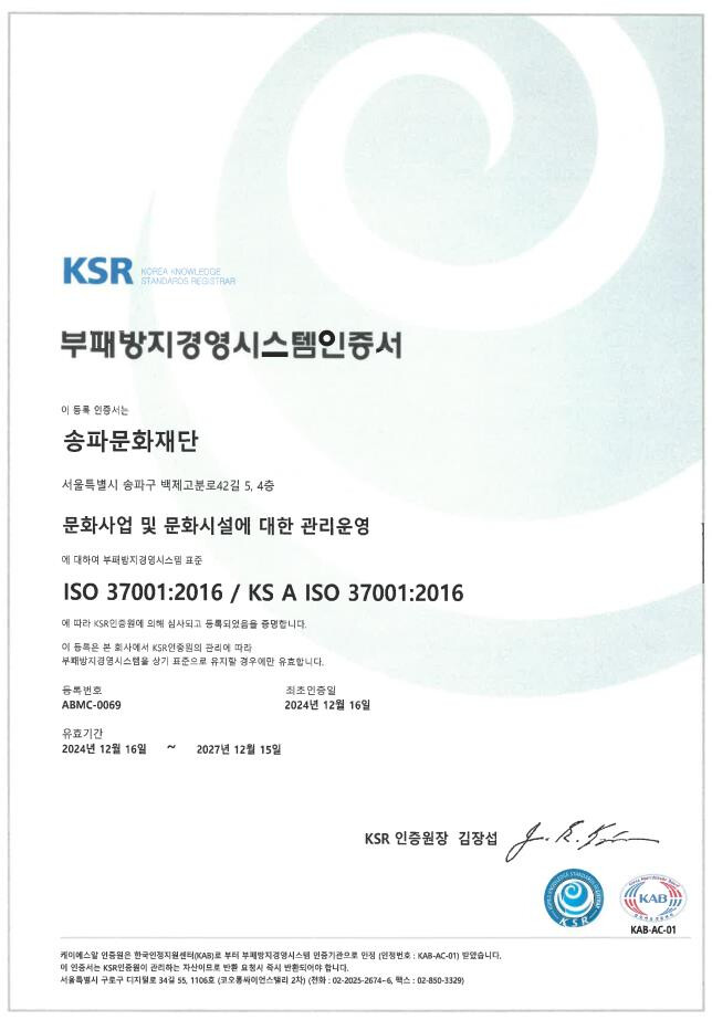 한편, 송파문화재단은 지역 문화예술 진흥을 위해 다양한 공연, 전시, 문화예술교육 및 지원사업을 운영하며 구민과 함께 성장하는 문화재단으로 나아가고 있다. 이번 ISO 37001 인증은 2024년 12월 16일부로 유효하며, 2027년 12월 15일까지 유지된다.