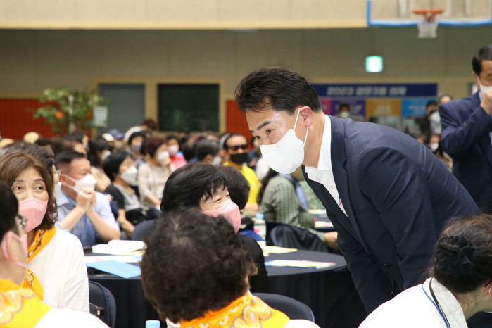 서울 도봉구 제2회 쌍문3동 주민총회가 최근 열려 주민자치회 감사보고, 의제개발 경과보고, 2023년 자치계획 보고, 자치계획 의결 등이 이어졌다. 사진은 주민총회에 참석한 오언석 구청장(오른쪽)이 주민들과 인사를 나누는 모습. (사진제공=도봉구청)