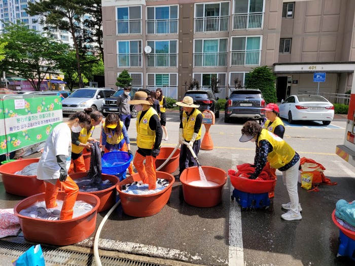 경기 양주시 양주2동 적십자봉사회는 지난 10일 소외된 이웃을 위해 봄맞이 ‘이불 세탁 봉사’를 진행했다. 이날 대한적십자사 의정부봉사관의 이동 세탁 차량을 지원받아 이불 40여채를 수거하고 세탁 후 배달했다. 사진은 봉사자들이 이불 세탁을 하고 있는 모습.(사진제공=양주시청)