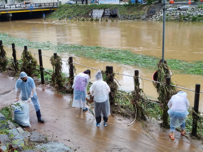 경기 안산시 단원구 중앙동 통장협의회는 최근 집중호우로 범람한 안산천변 침수 피해를 예방하기 위해 긴급 환경정비에 나서 안산천변 쓰레기와 각종 오염물질을 수거하고 배수로 정비를 하는 등 적극적인 봉사활동을 펼쳤다. 사진은 이날 통장협의회 회원들이 환경정비 활동을 하고 있는 모습. (사진제공=안산시청)