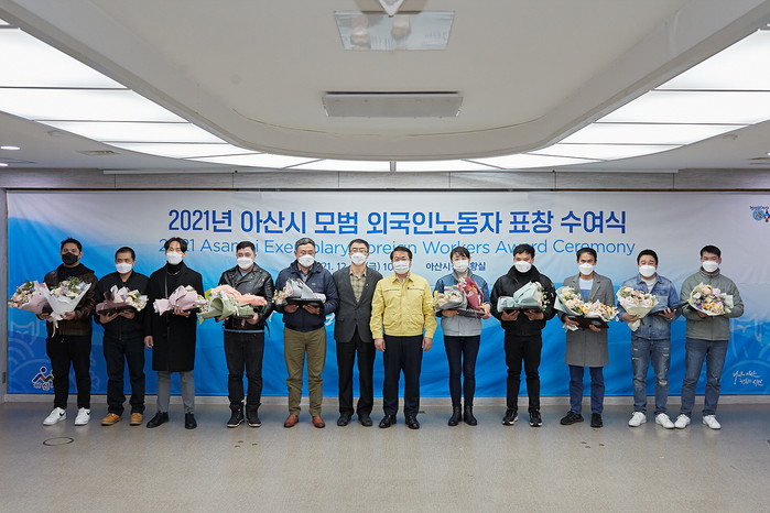 충남 아산시가 10일 외국인노동자 소속 기업 동료들과 이주노동자 관계자들이 참여한 가운데 '2021년 아산시 모범 외국인 노동자' 표창 수여식을 개최했다. 이날 시는 외국인노동자 권리증진과 지역경제 발전을 위해 노력한 모범적인 외국인 노동자 10명을 선발해 표창장을 수여했다. 사진은 오세현 시장(오른쪽 여섯 번째)이 수상자들과 기념촬영을 하는 모습. (사진제공=아산시청)