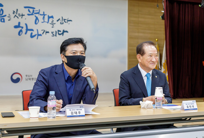 김태우 서울 강서구청장이 지난 26일 민주평화통일자문회의 강서구협의회 정기회의에 참석했다. 사진은 이날 회의에서 김 구청장(왼쪽)이 한반도의 평화와 미래에 대해 발언을 하고 있는 모습. (사진제공=강서구청)