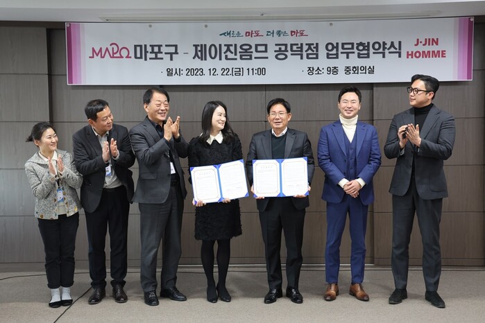 | ▲ 지난해 12월 청년 면접 정장 무상 대여를 위한 마포구-제이진옴므 공덕점 업무협약식에서 박강수 구청장(오른쪽 세 번째)이 협약 체결 후 관계자들과 기념촬영을 하는 모습. (사진=마포구청 제공) |