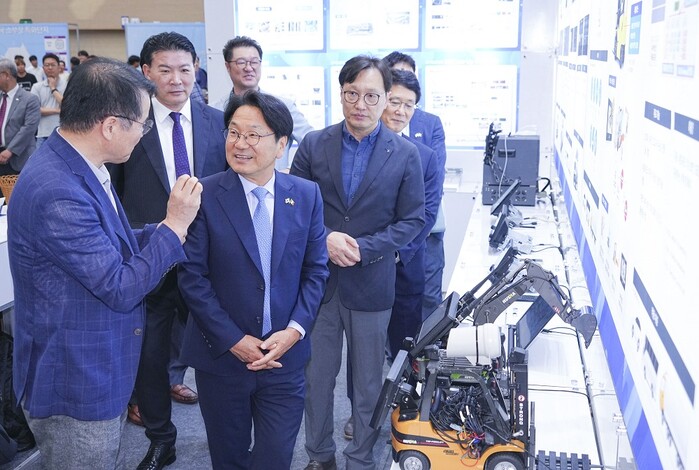 | ▲ 강기정 광주광역시장이 27일 오후 서구 김대중컨벤션센터에서 열린 ‘제1회 글로벌 소부장 기술포럼’ 홍보부스를 둘러 보고 있다./광주광역시 제공 |