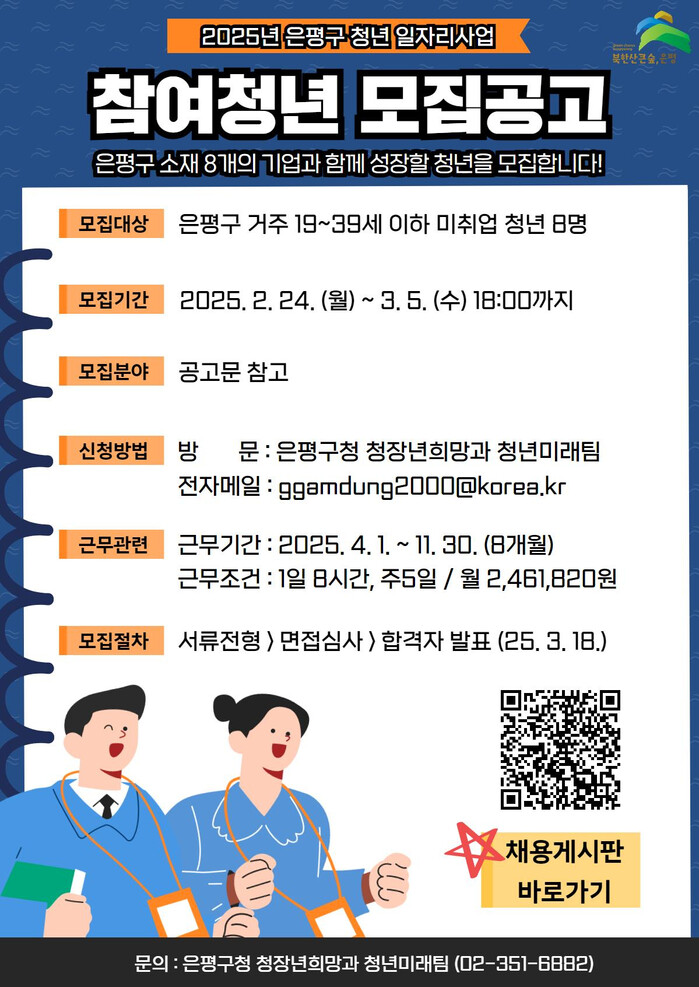 자세한 사항은 은평구청 누리집 채용공고를 통해 확인하거나 은평구청 청장년희망과 전화로 문의하면 된다.