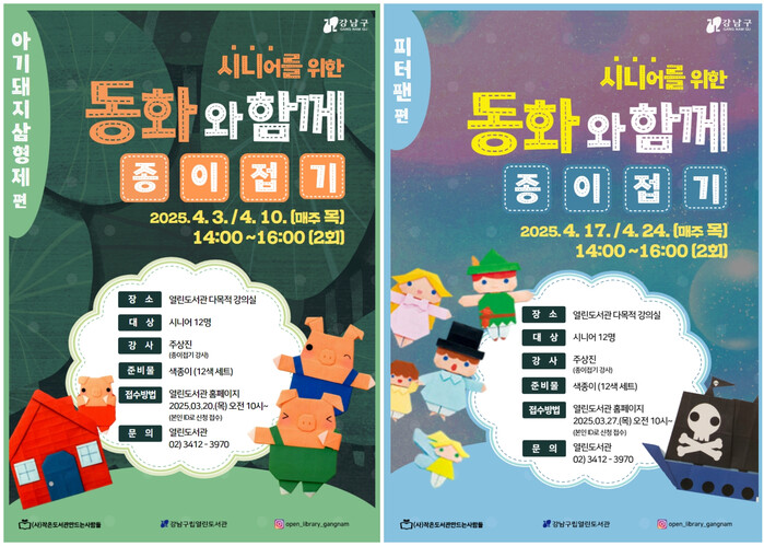 참여 신청은 <아기 돼지 삼형제 편>은 3월 20일 (목) 오전 10시부터, <피터팬 편>은 3월 27일 (목) 오전 10시부터 강남구립열린도서관 홈페이지에서 선착순으로 진행된다. 프로그램과 관련한 자세한 사항은 강남구립열린도서관 홈페이지를 참고하거나 전화문의를 통해 확인하길 바란다.