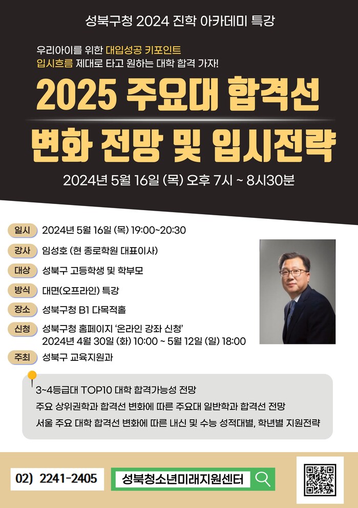성북구 첫 번째 진학아카데미 특강은 「2025 주요대 합격선 변화 전망 및 입시전략」이라는 주제로 오는 16일 오후 7시~8시30분 성북구청 B1층 다목적홀에서 오프라인으로 진행된다.