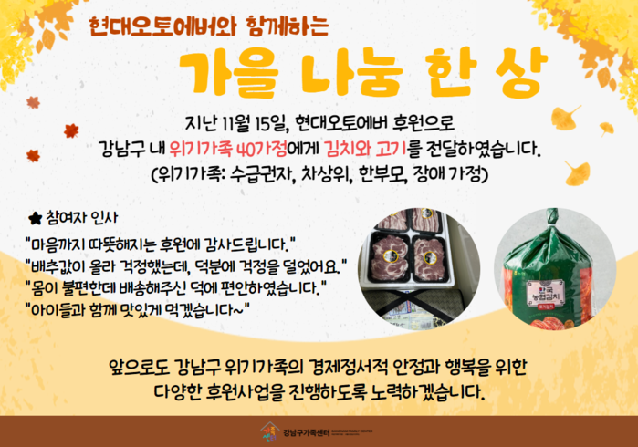 온가족보듬사업 ‘가을 나눔 한 상’ 은 현대오토에버 후원과 서울시사회복지기관협의회 지원으로 진행되었으며, 기초생활수급·차상위·한부모·장애가정 등 강남구 내 위기가족 40가정에 한돈 2kg, 김치 5kg 등 10만 원 상당의 식료품을 가정으로 배송하였다.