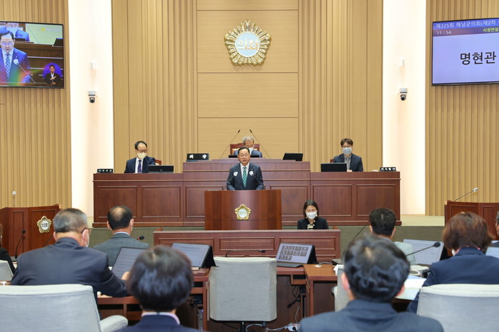 [해남=정찬남 기자] 명현관 전남 해남군수는 22일 해남군의회 정례회 시정연설을 통해 2023년 군정의 목표를 해남형 ESG 경영의 확산을 통해 더 깨끗하고, 더 안전하며, 더 유능한 군정으로 민선8기 도약을 이끌겠다고 밝혔다.
