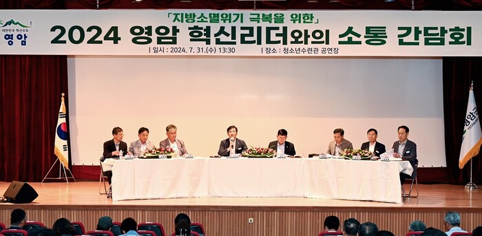 | ▲ 우승희 영암군수(왼 쪽부터 네 번째)가 지난 7월31일 청소년수련관에서 열린 2024 영암 혁신위원와 소통간담회를 주재하고 있다. / 영암군 제공 |