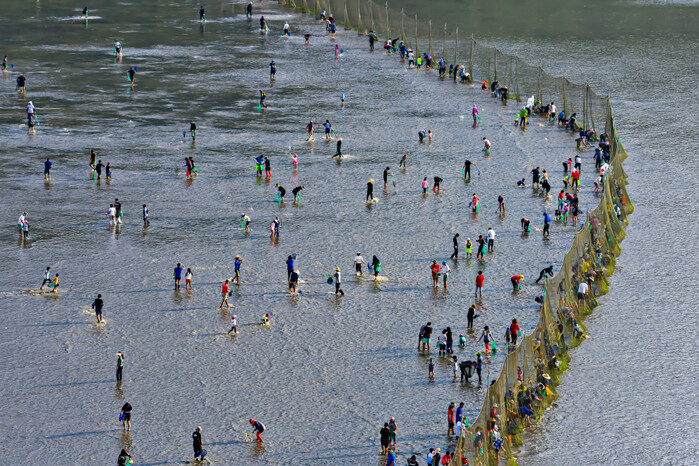 물이 빠진 갯벌 위 그물에는 주로 숭어, 농어, 돔 등의 다양한 어류가 걸리게 되며 이때 체험 관광객들이 갯벌 안으로 들어가 맨손으로 직접 잡는다.