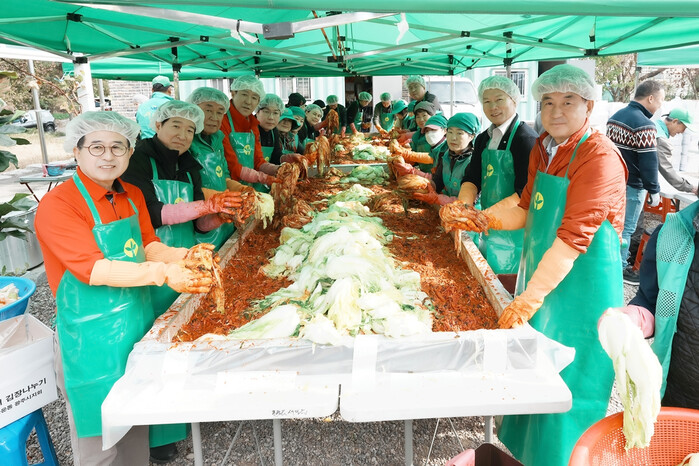 경기 광주시 초월읍 새마을지도자협의회와 새마을부녀회가 최근 늑현리 새마을회 사무실에서 ‘사랑의 김장 담그기’ 행사를 개최했다. 이번 행사에는 새마을지도자와 부녀회원 50여명이 참여했으며, 완성된 김치는 초월읍 내 마을별 취약계층 가정에 전달될 예정이다. 사진은 행사에서 방세환 시장(맨 앞 오른쪽)이 김장을 담기에 참여하고 관계자들과 기념 촬영을 하는 모습. (사진=광주시청 제공)