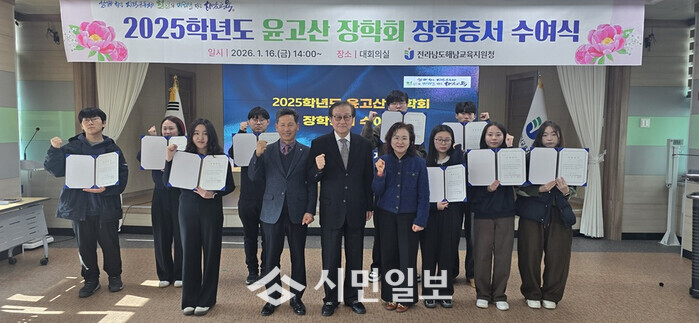 | ▲ 해남교육지원청, 2025학년도 윤고산 장학회 자학증서 수여 후 기념촬영 / 해남교육지원청 제공 |