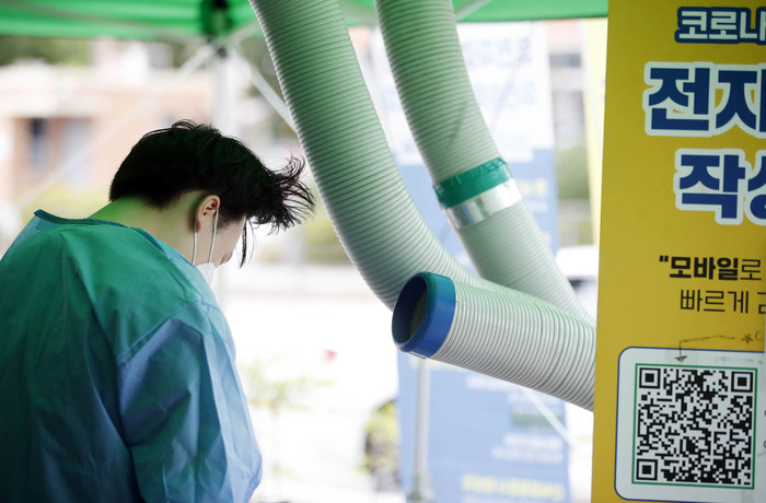 폭염주의보가 내려진 지난 4일 오후 광주 북구 상시선별진료소에서 보건소 의료진이 야외에 설치된 냉방기 앞에 서서 더위를 식히고 있다.