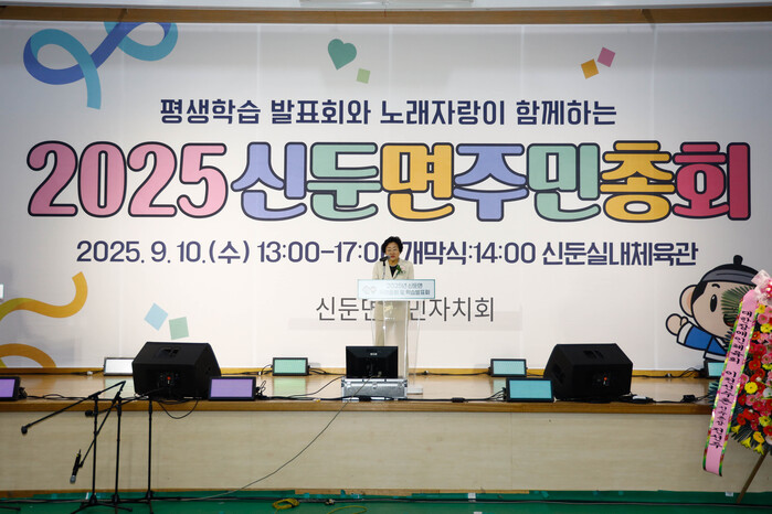 경기 이천시 신둔면 주민자치회가 최근 신둔실내체육관에서 학습발표회와 노래자랑이 어우러진 2025년 신둔면 주민총회를 성공적으로 개최했다. 사진은 행사에 참석한 김경희 시장이 인사말하는 모습. (사진=이천시청 제공)