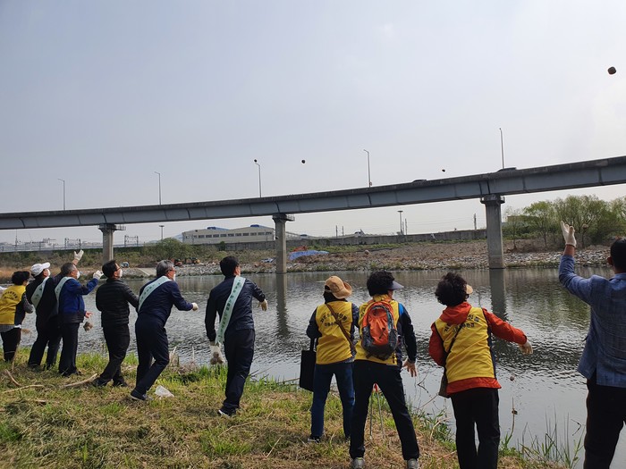 서울 성동구는 제52회 지구의 날을 기념해 지난 21~22일 구민들과 함께 중랑천 정화를 위한 EM 흙공 던지기, 폐건전지 모으기 캠페인 등 환경보전 활동을 실시했다. 사진은 구민과 함께 ‘EM 흙공 던지기’를 진행하고 있는 모습. (사진제공=성동구청)