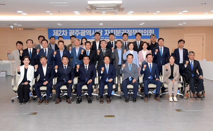 | ▲ 강기정 광주광역시장(앞줄 가운데)이 24일 오전 시청 중회의실에서 열린 '제2차 자치분권정책협의회 회의'에 참석해 기념촬영을 한 후 인사말을 하고 있다./광주광역시 제공 |