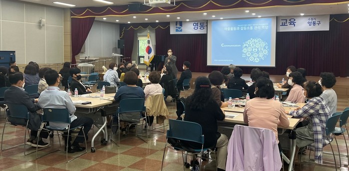 경기 수원시 영통구는 28일 각동 직능단체원을 대상으로 ‘갈등관리 및 소통역량 강화’를 주제로 교육을 진행했다. 사진은 이날 초빙된 강정모 시민교육콘텐츠연구소 소장이 강의를 진행하고 있는 모습. (사진제공=영통구청)