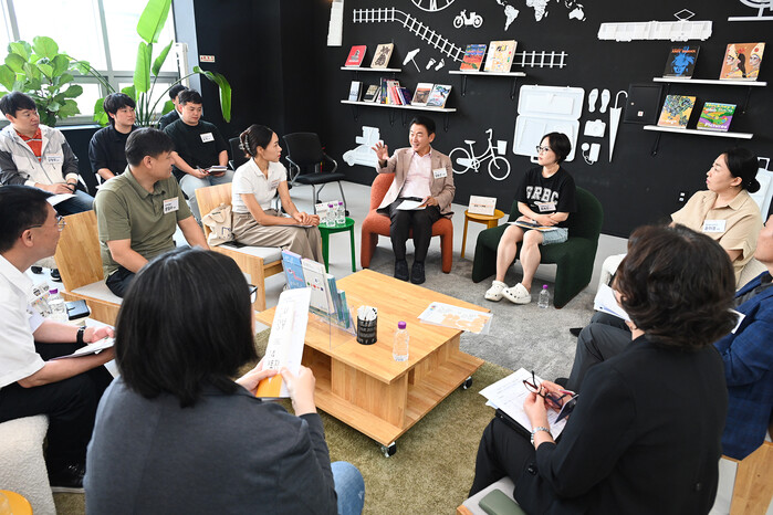 경기 의정부시가 15일 복합문화공간 ‘의정부문화역 이음’에서 시민과 함께 문화정책에 대해 논의하는 간담회를 개최했다. 사진은 김동근 시장이 시민들과 문화정책에 대해 논의하는 모습. (사진=의정부시청 제공)
